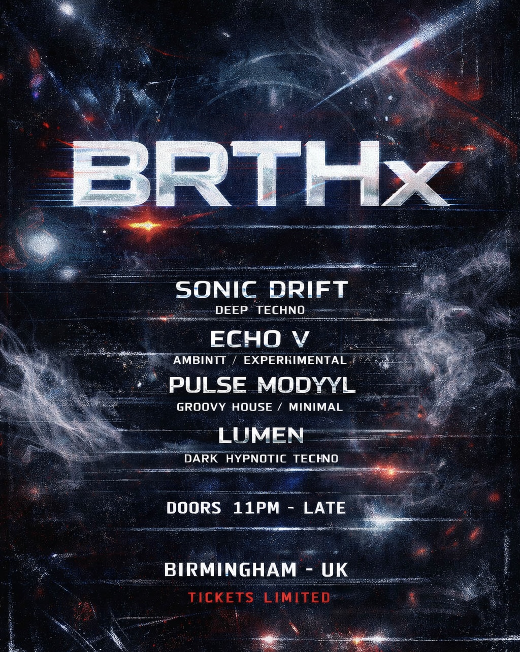 Secret Location in Birmingham: The venue will be revealed to ticket holders 6–12 hours before the event, keeping the experience tight and immersive.