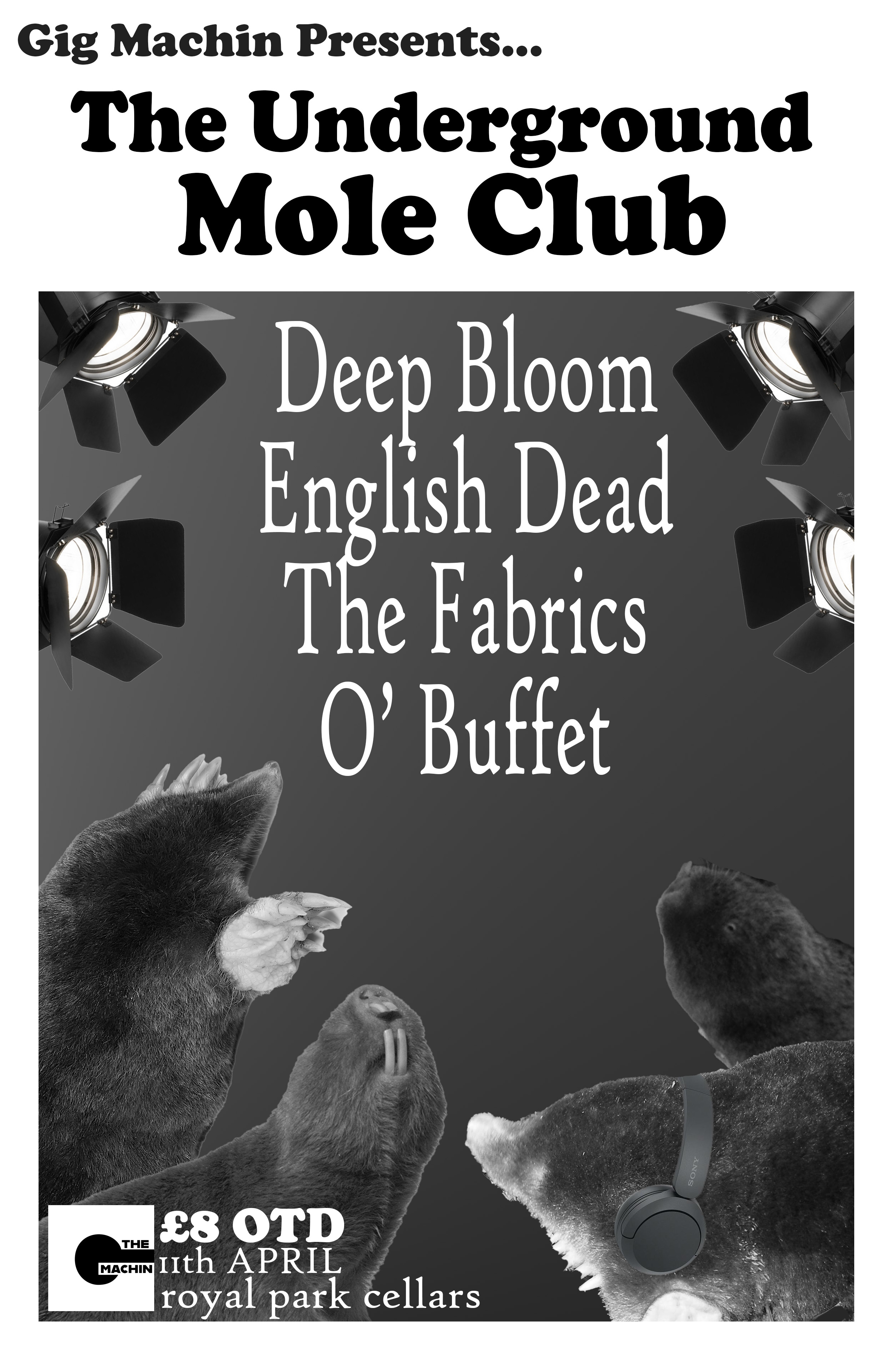 Four great bands enter Royal Park Cellar, I promise you they aren't humans and are just very human looking moles. The fantastic Deep Bloom, English Dead, The Fabrics and O'buffet are mole loving musicians ready to play to a crowd of (hopefully) moles.