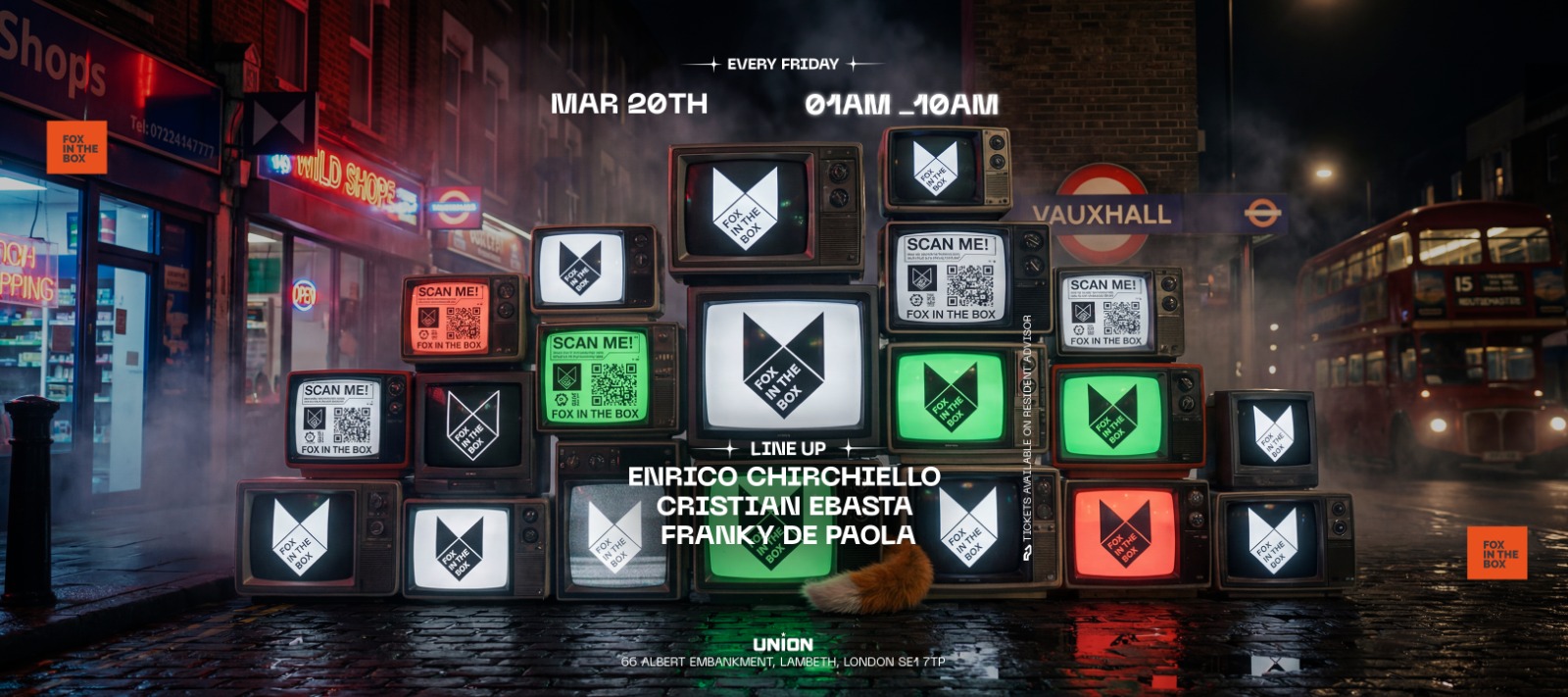 London’s late-night playground just got wilder. Fox In The Box is your weekly Friday night after-party for those who don’t believe in bedtime. From deep grooves to high-energy beats, this is where the real party begins—when everyone else is heading home. Taking over the iconic Union Club in Vauxhall, Fox In The Box brings you a rotating lineup of weekly DJs, special guests, and a crowd that knows how to keep it going ‘til sunrise and beyond. LINE-UP (varies weekly): • Resident DJs • Special Guest Appearances £20 - On The Door DOOR POLICY: 18+ ONLY – VALID ID IS A MUST. NO ID = NO ENTRY. We’re all about good energy, no bad attitudes. Zero tolerance for rudeness, violence, or any disrespect—toward guests or staff. Dress how you feel. All are welcome. Just bring the right vibe