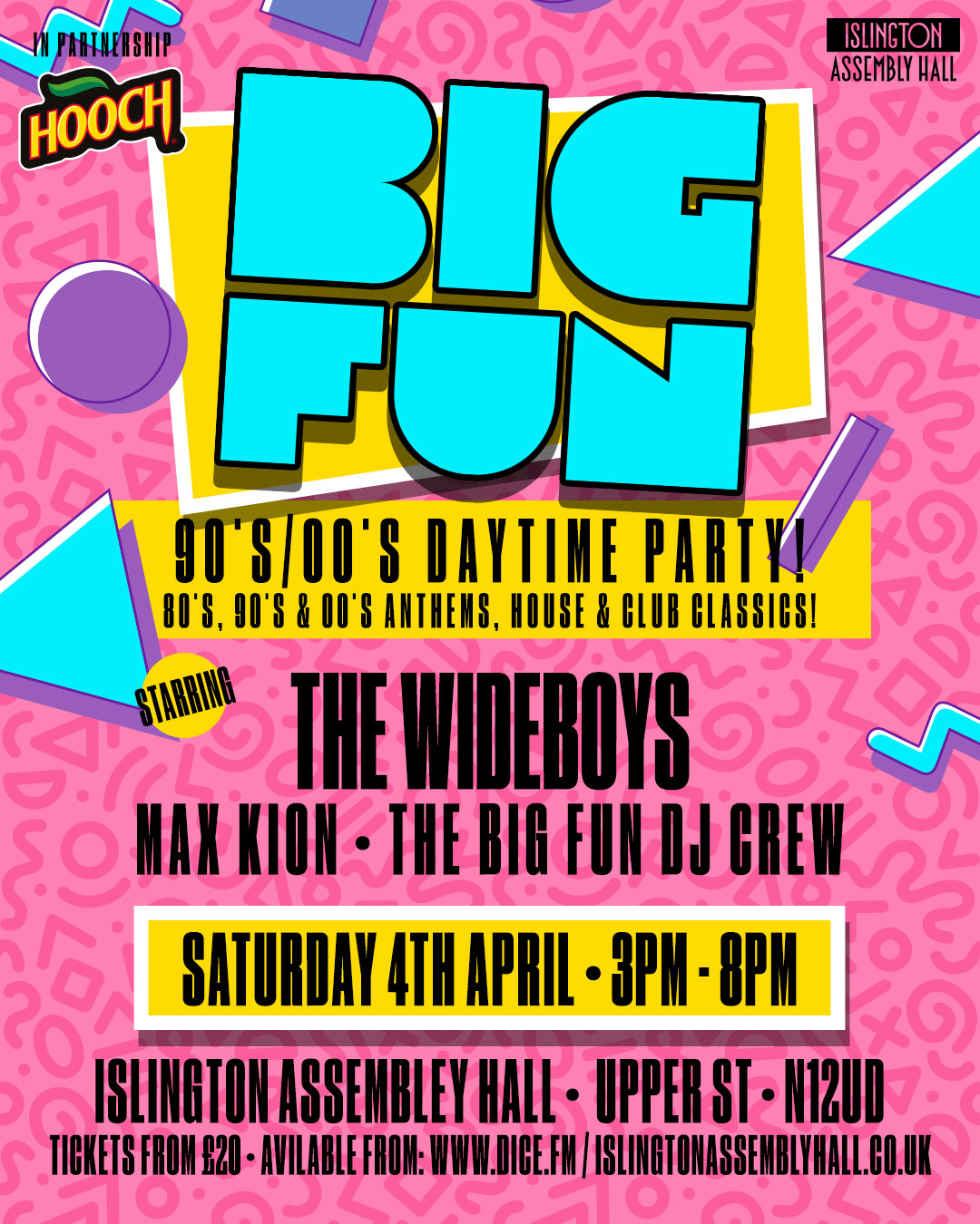 Landing at the iconic Islington Assembly Hall, BIG FUN! brings the full energy of a proper rave into the daylight hours — no late nights, no regrets, just pure nostalgia, massive tunes and wall-to-wall good vibes.Sound tracking the party are the HUGELY popular, WIDEBOYS, delivering their legendary sing-along anthems including 'Sambuca' and 'Messing Around', plus an infectious 90s-driven set from new sensation DJ & Producer, MAX KION, supported by the BIG FUN DJ Crew – DJ E.V.T, Tahnee Aura, DJ Hooch & Djmrblue with live vocals from Da Sweetnezz. Expect classic dance anthems, house, club classics and hands-in-the-air moments from start to finish — all wrapped up in a daytime-friendly schedule that lets you relive your best years and still make bedtime.