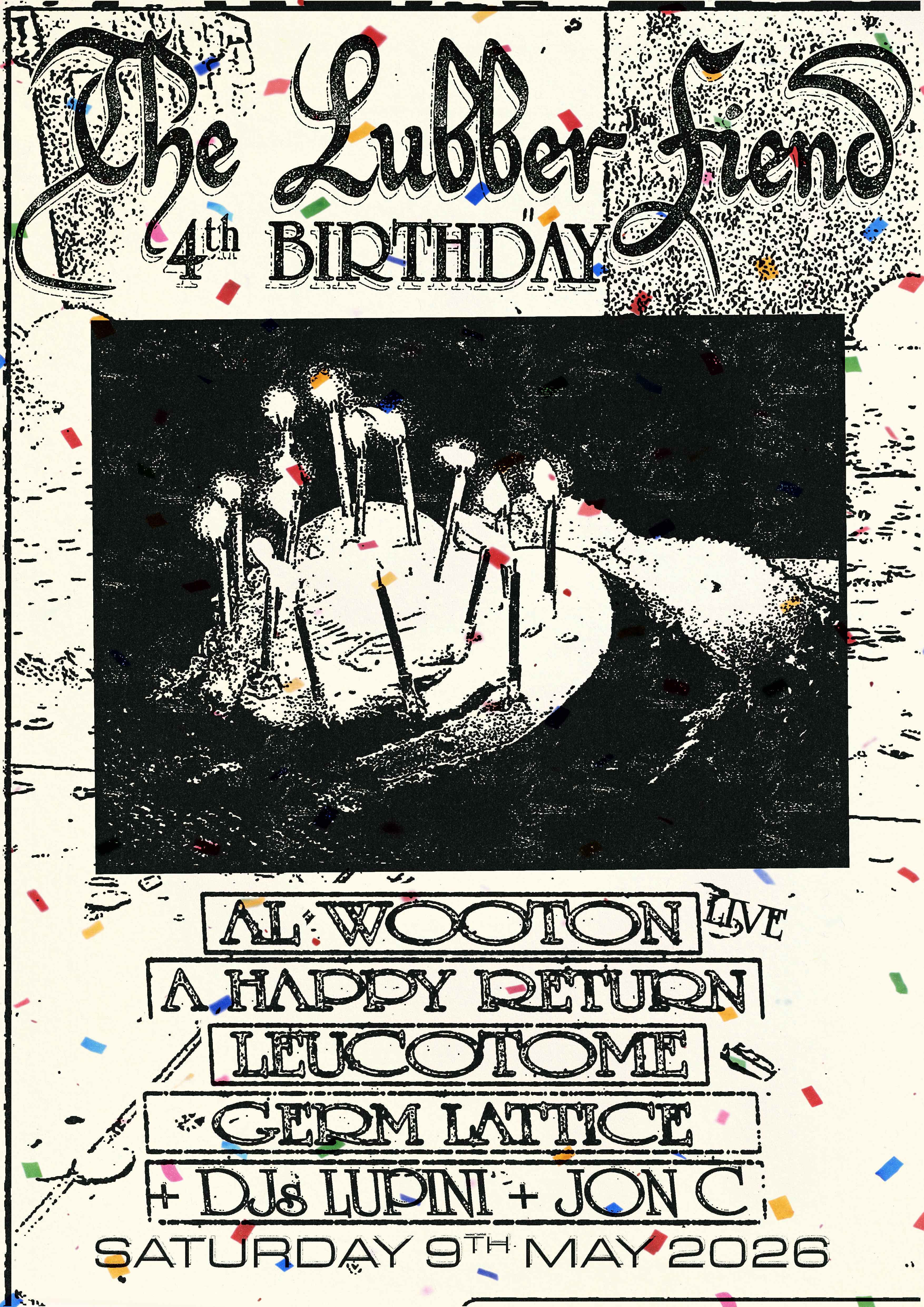 Full send for our 4th Birthday! We have gone big this year, what with it being the very notable 4th year of our existence. Its an absolute privilege for us to run the venue and to book artists that we love, and each year the birthday is meant to be a real celebration of what we do. Hard to argue with this years line up! We have Al Wooton headlining with his serpentine heads down Dub-Techno, Germ Lattice bring the wonkiest post-punk, A Happy Return is a beautiful homespun kind of minimal folk and Leucotome self describe as a Organic Industrial Femme Folk Cult. As if that wasn't enough, we're staying open late-late with the wonky post-everything sounds of the NTS resident Lupini and house fiend Jon C.